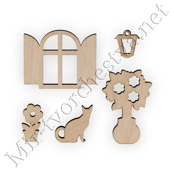 Заготовка для декорирования ВД-522 Мини-набор "Окно, цветы, фонарик, кошка" фанера 1.3x4.3x0.3 см 0.3 см, Mr. Carving