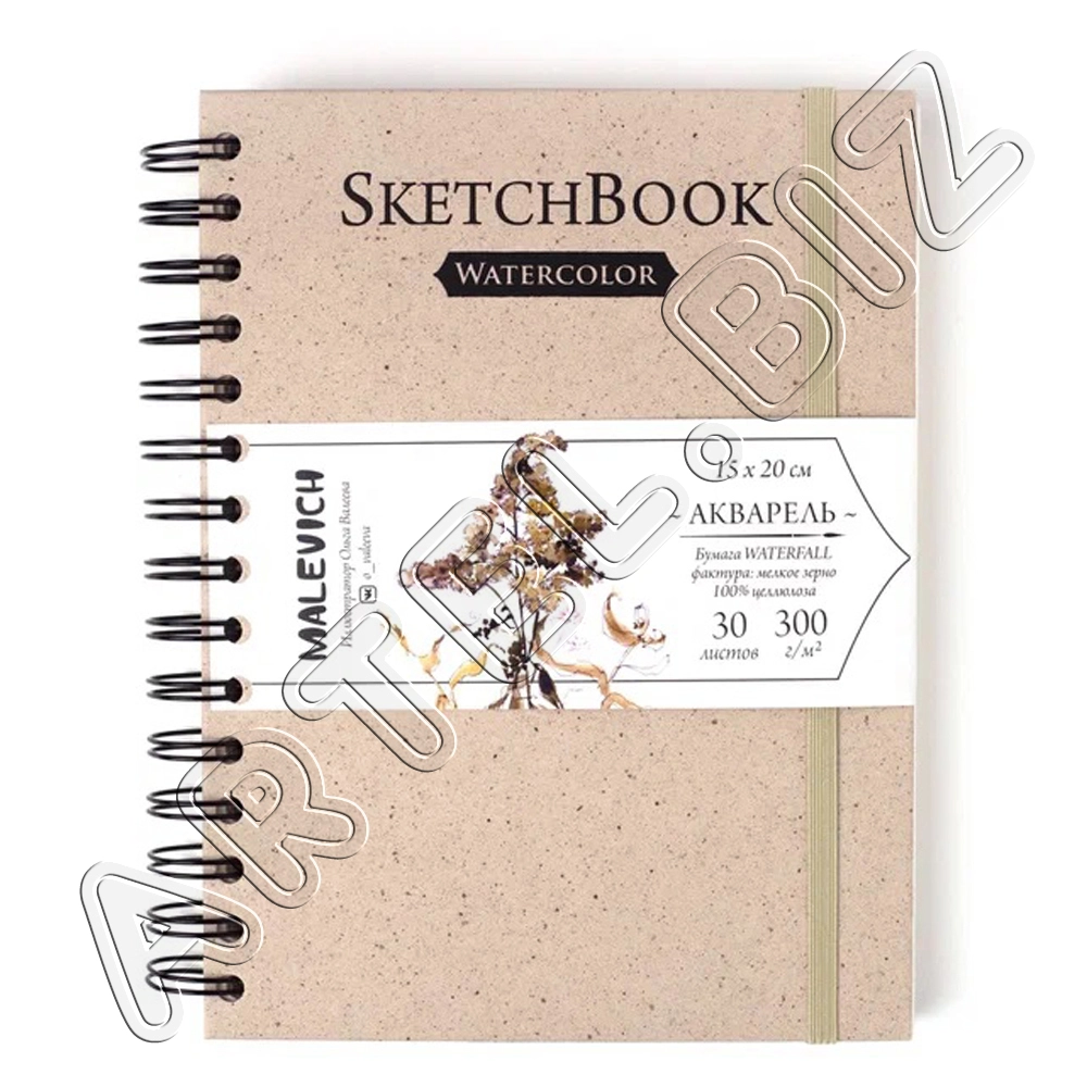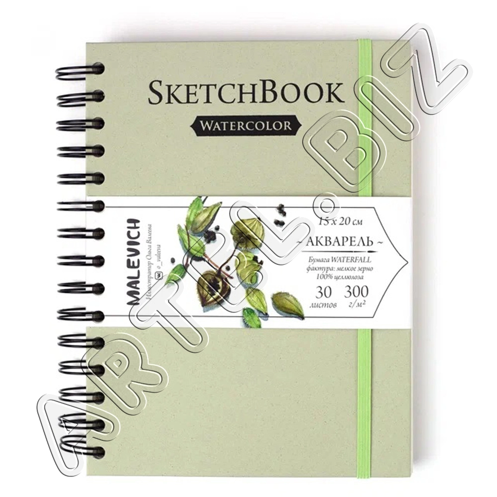 Скетчбук Nature для акварели, 100% Целлюлоза WaterFall, спираль, Салатовый, 300 г/м2, 15х20 см, 30л., Малевичъ