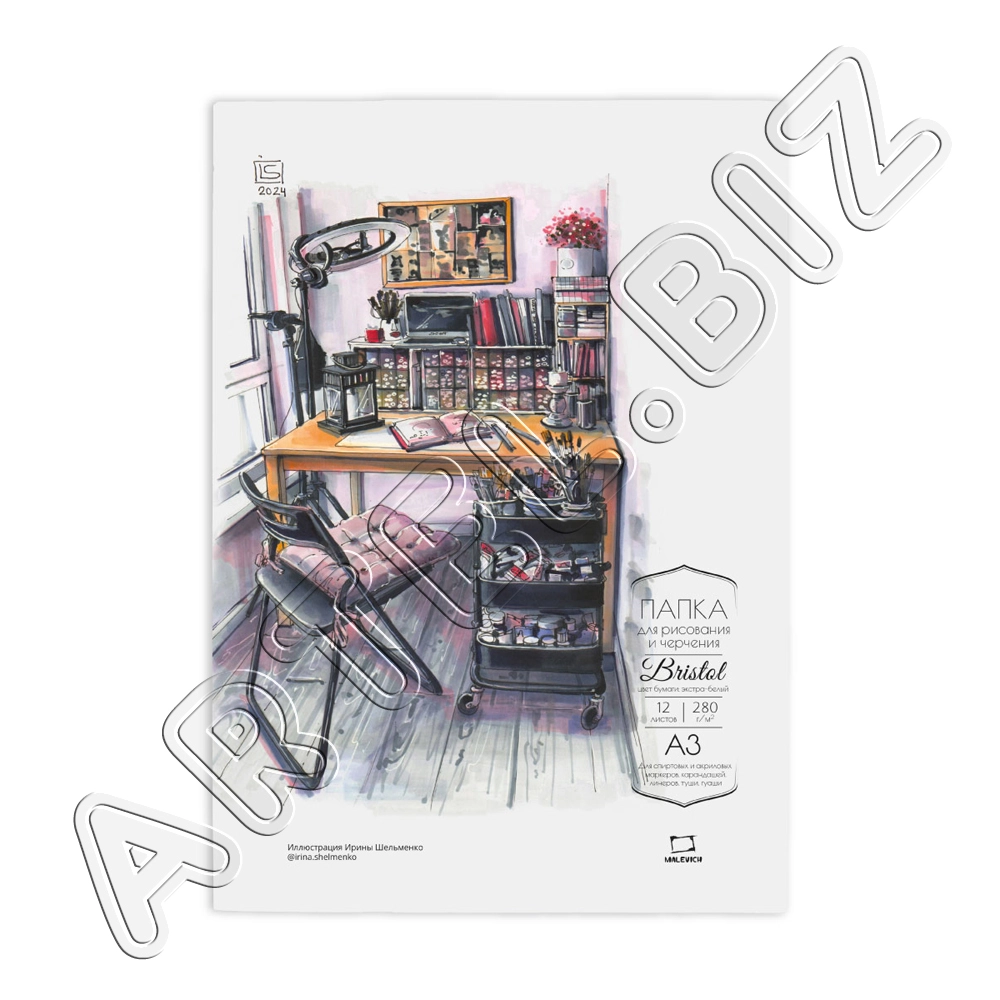 Папка с бумагой для графики и маркеров Bristol, 280 г/м2, А3, 12л., Малевичъ