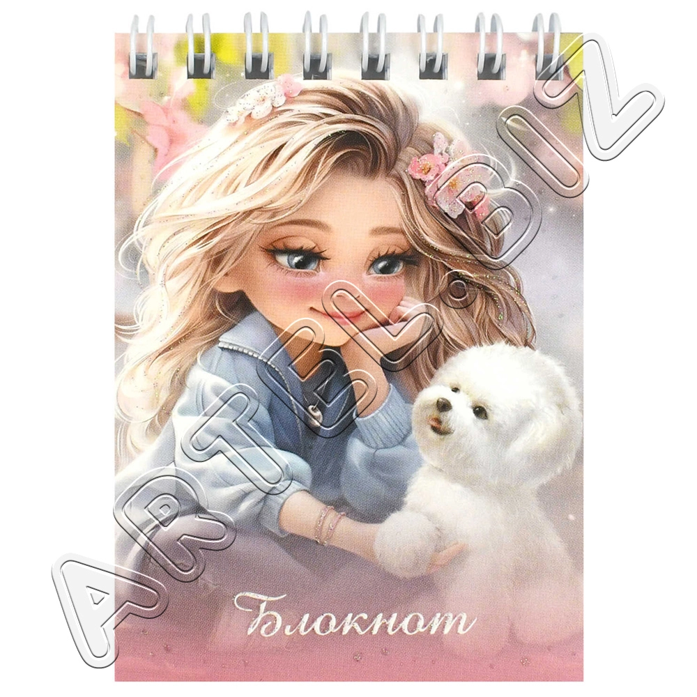 Блокнот А7 гребень 40л БЛОНДИНКА С СОБАЧКОЙ клетка арт.70956